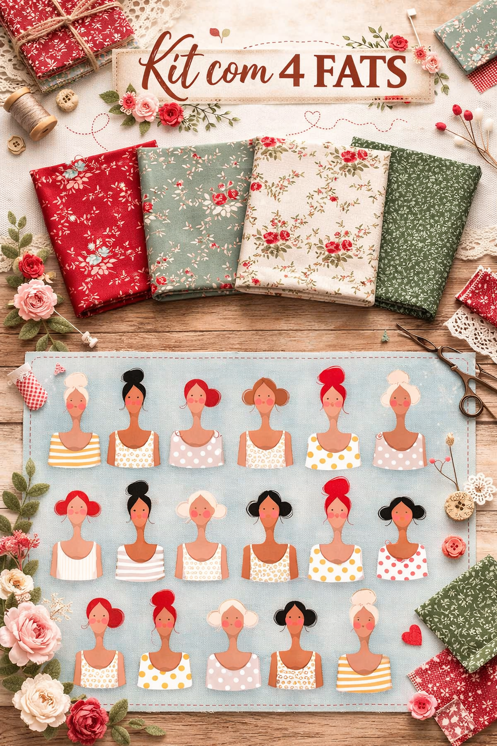 Além disso, você recebe um recorte especial com 4 bonequinhas da estampa (sendo 2 maiores e 2 menores), ideais para aplicações e projetos criativos.